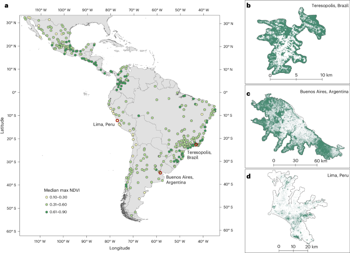 Urban Green Space (UGS), a term used to describe natural or man-made plant life spaces like urban parks, yards, gardens, forests, some agricultural areas, and many other forms. This article investigates 371 large cities across 11 countries in Latin America to understand not just how much green space there is, but also how it’s spread out and what urban parks look like. They compared factors like natural environment (climate), built environment (population, density, street intersections), and socioeconomic conditions (GDP, unemployment, education). What they found was that green space varies a lot across cities. Climate zones were the biggest driver in explaining how much total green space a city has, while education levels, street intersection density, and population density mattered more for whether a city had accessible urban parks. The key takeaway is that climate plays a huge role in shaping green space availability, but because there are big inequalities between cities, not everyone has the same chance to benefit from it. This shows that some cities may struggle more than others to use green spaces as solutions for heat and health challenges. | El término Espacio Verde Urbano (EVU) es un término que se usa para describir áreas de vegetación natural o creadas por el ser humano, como parques urbanos, patios, jardines, bosques, algunas zonas agrícolas y muchas otras formas. Este artículo investiga 371 grandes ciudades en 11 países de América Latina para entender no solo la cantidad de área verde que existe, sino también cómo está distribuida y cómo se ven los parques urbanos. Se compararon factores como el entorno natural (clima), el entorno construido (población, densidad, intersecciones viales) y las condiciones socioeconómicas (desempleo, educación). Lo que se encontró fue que el espacio verde varía mucho entre las ciudades. Las zonas climáticas fueron el factor más importante para explicar la cantidad total de espacio verde en una ciudad, mientras que el nivel educativo, la densidad de intersecciones viales y la densidad de la población afectaron más si una ciudad tenía parques urbanos accesibles. La conclusión principal es que el clima juega un papel enorme en la disponibilidad de espacios verdes, pero debido a las grandes desigualdades entre ciudades, no todas las personas tienen la misma oportunidad de beneficiarse de ellos. Esto muestra que algunas ciudades pueden tener más dificultades que otras para usar los espacios verdes como soluciones frente al calor y los desafíos de salud. |